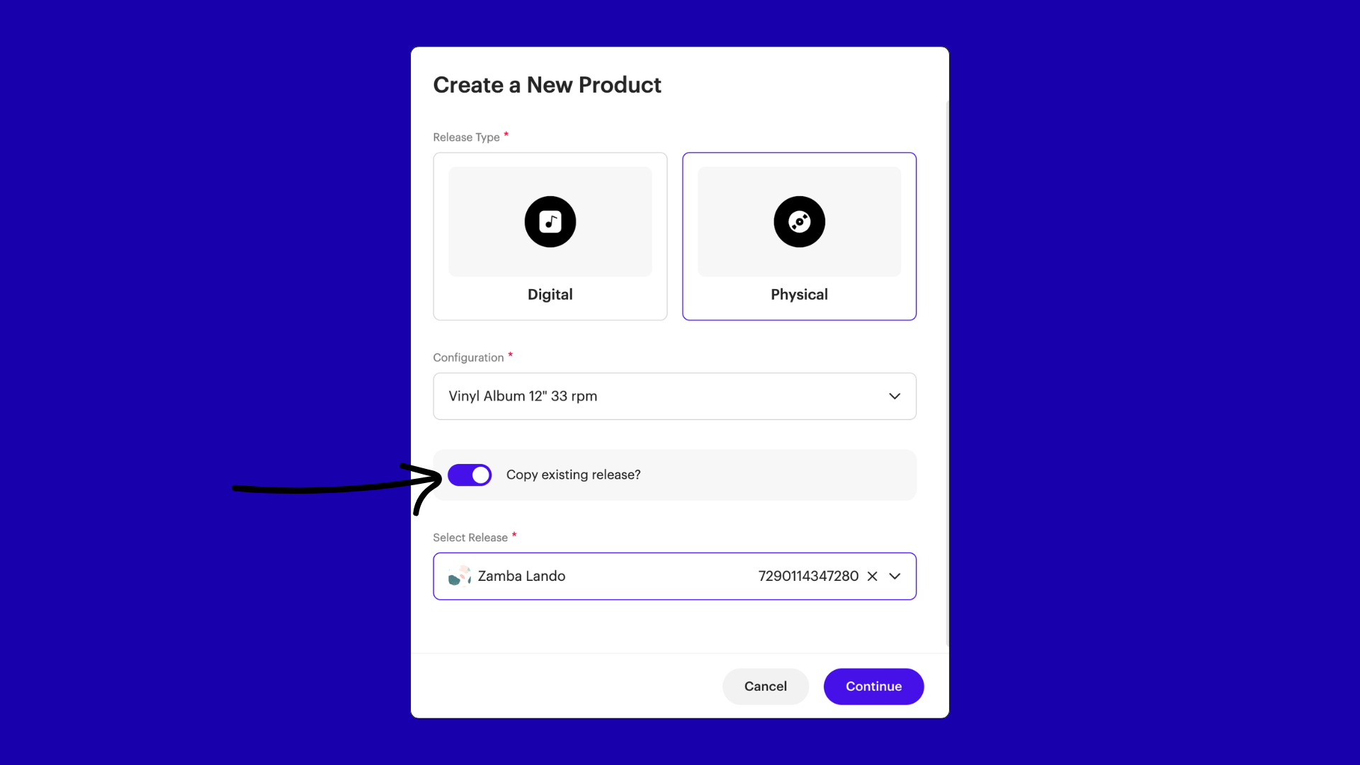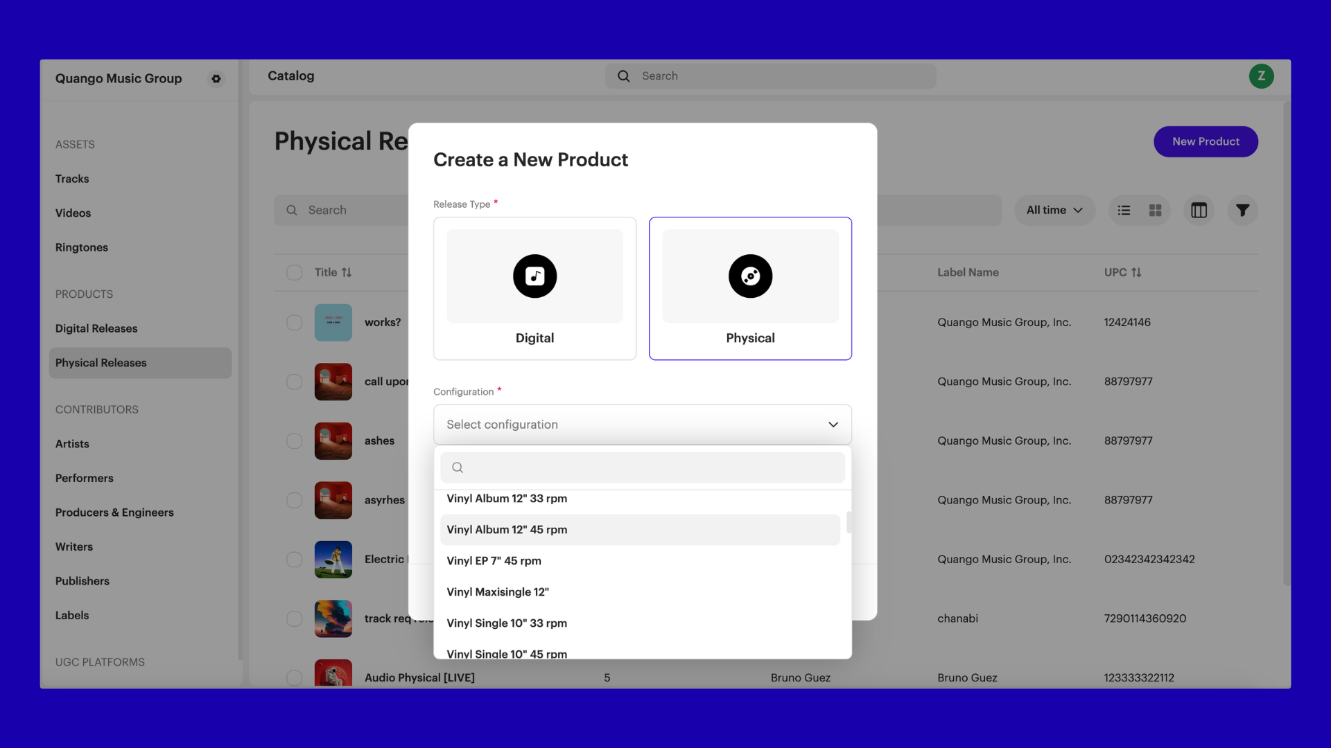 Physical Release Catalog Management allows you to create and manage physical formats—such as vinyl, CDs, cassettes, and DVDs—directly within your catalog.