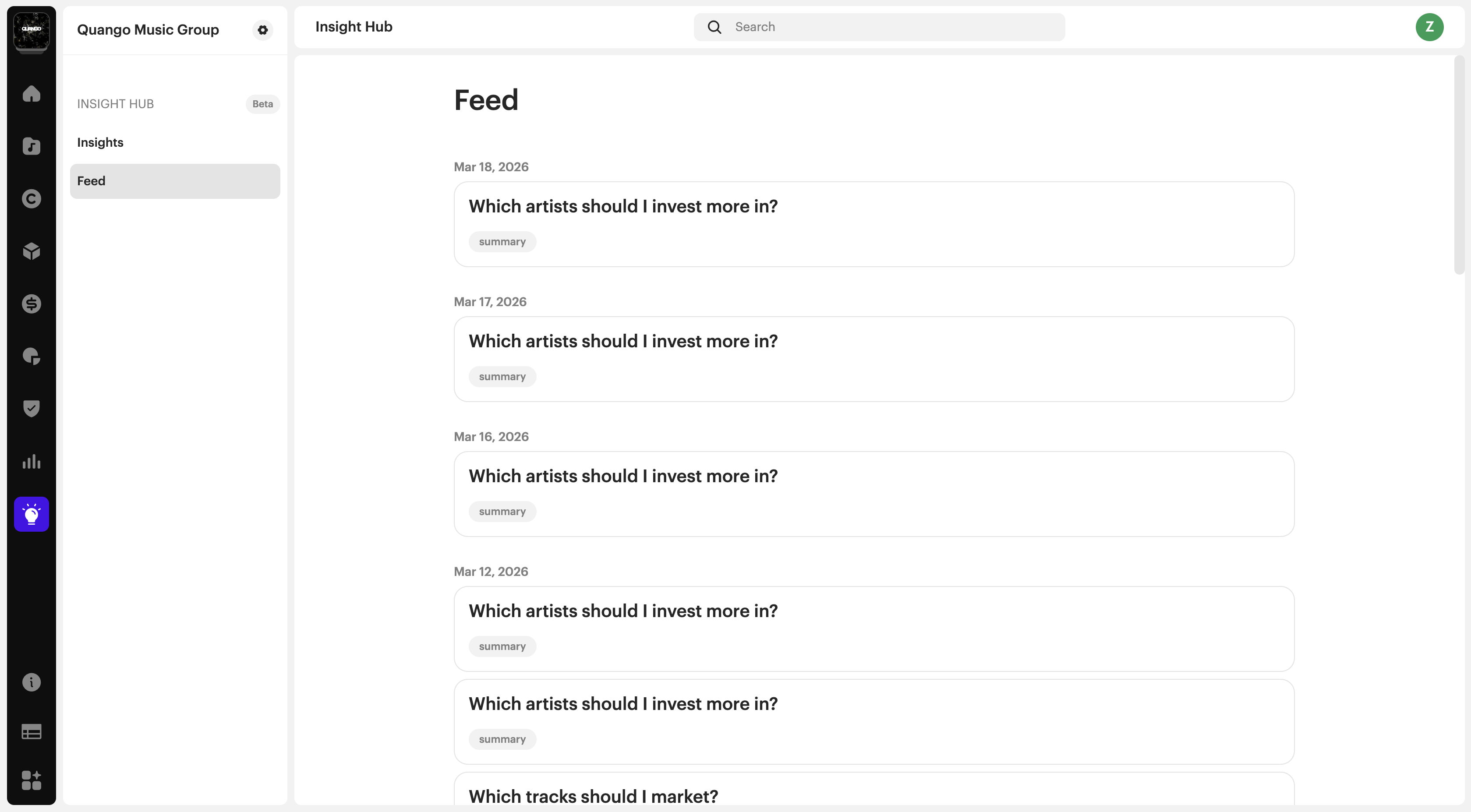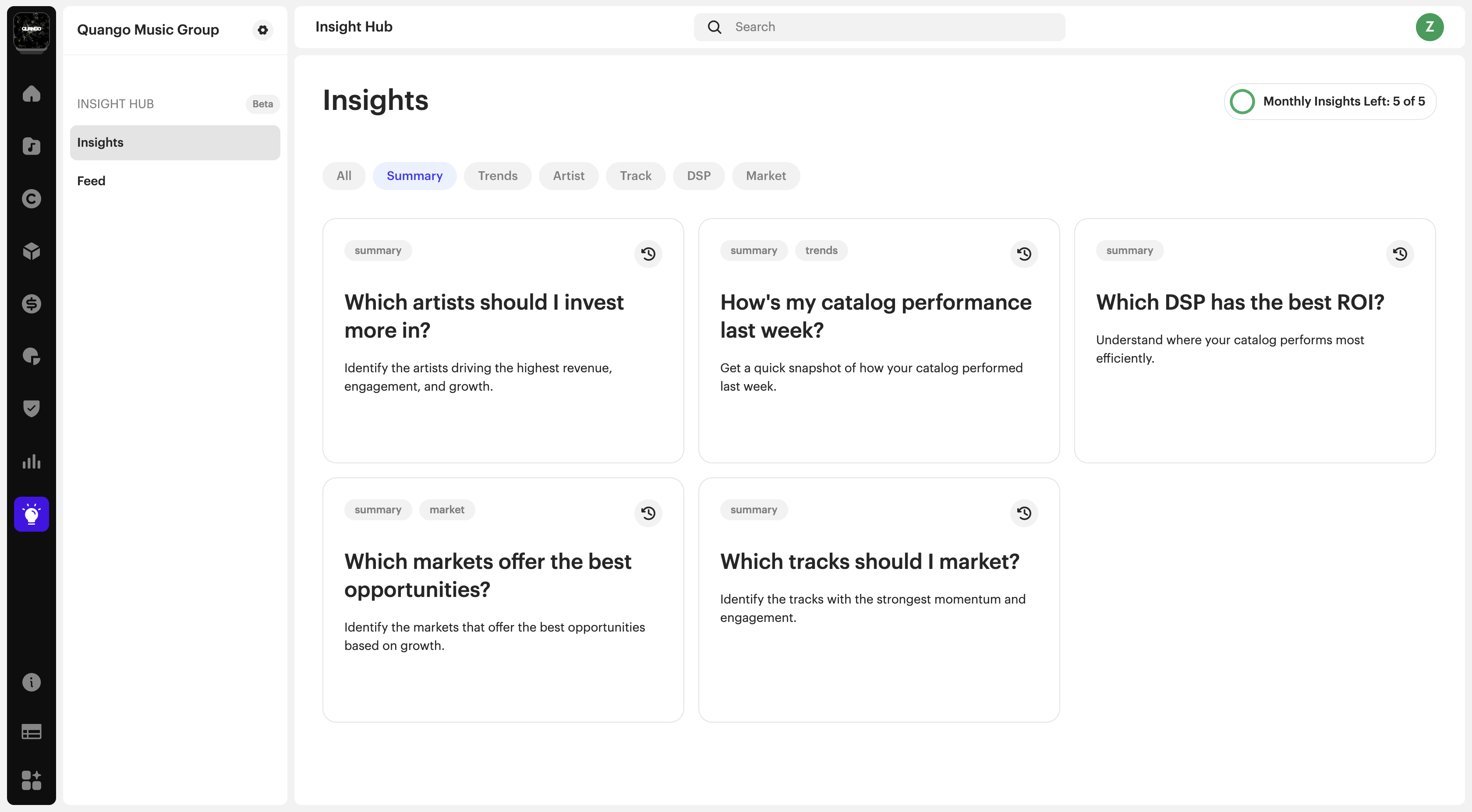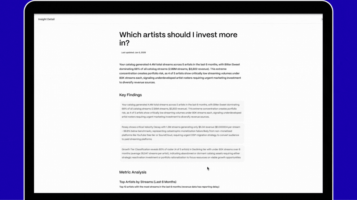 Instead of building reports manually, you can select from predefined questions across your artists, tracks, DSPs, markets, and trends, and generate clear, ready-to-use insights in seconds.